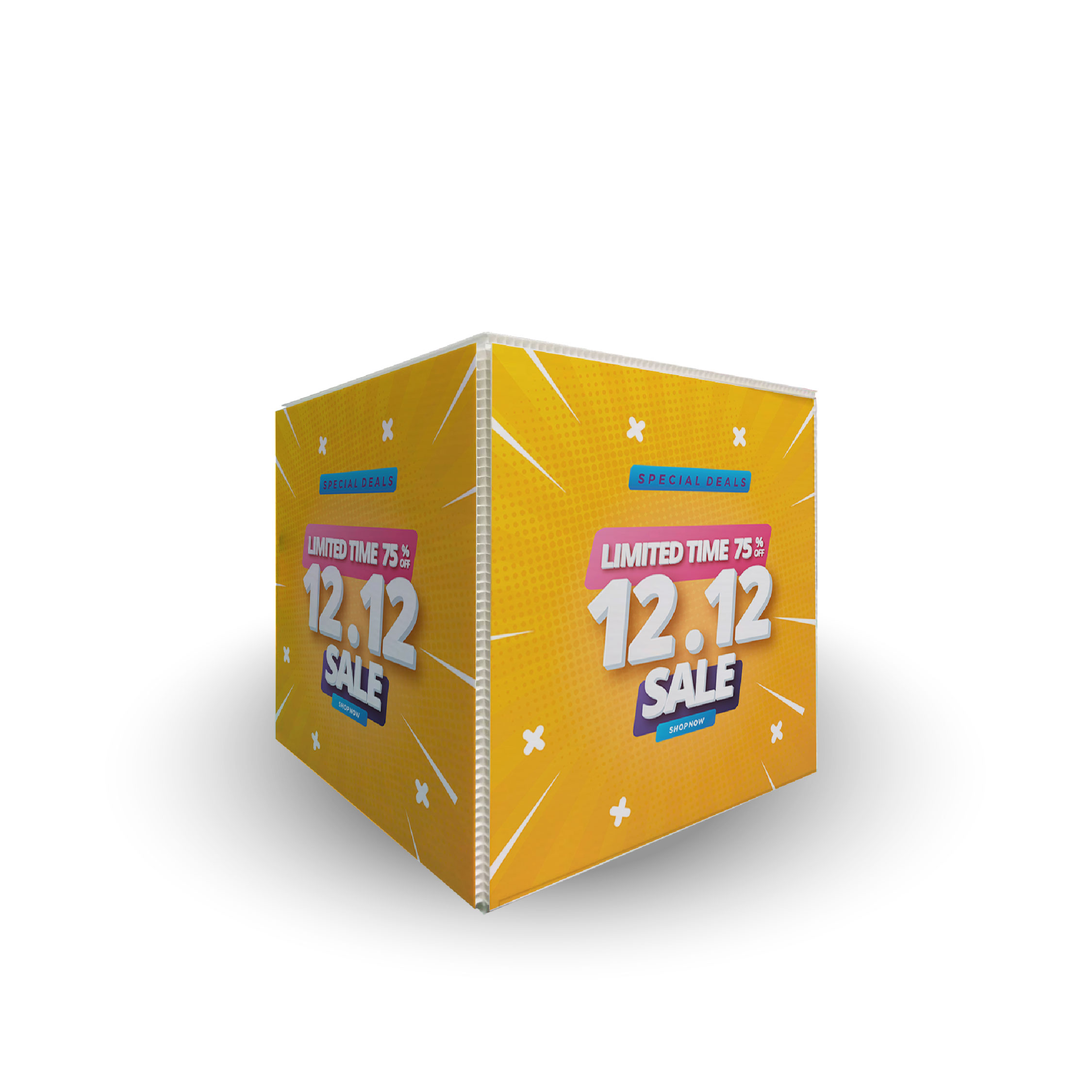 ป้ายโฆษณาและตกแต่งรูปแบบพิเศษ ผลิตจาก PP Board หนา 3 มม. แข็งแรง น้ำหนักเบา สามารถพิมพ์ลวดลายกราฟิกหรือข้อความลงบน PP Sticker Eco (คุ้มค่า ประหยัด) หรือ PET Banner (สีสดทนทาน) แล้วนำมาไดคัทขึ้นรูปตามต้องการ เช่น กล่อง ตัวการ์ตูน โลโก้ หรือรูปสินค้า รองรับงานพิมพ์ขนาดใหญ่สูงสุด 120 × 240 ซม. เหมาะสำหรับเพิ่มความน่าสนใจและดึงดูดสายตาในงานอีเวนต์และร้านค้า